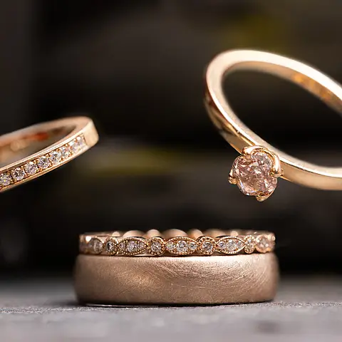 Damit der Vorsteckring gleichmäßig am Ehering anliegen kann, spielen Steinfassung und Materialstärke eine entscheidende Rolle. So kann die sogenannte Krappenfassung einem einen Strich durch die Rechnung machen, diese eignet sich nicht für Vorsteckringe. Außerdem sollte die gleiche Materialstärke vorliegen, damit kein unschöner Absatz zwischen den beiden Ringen entsteht.